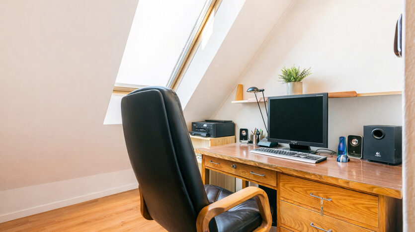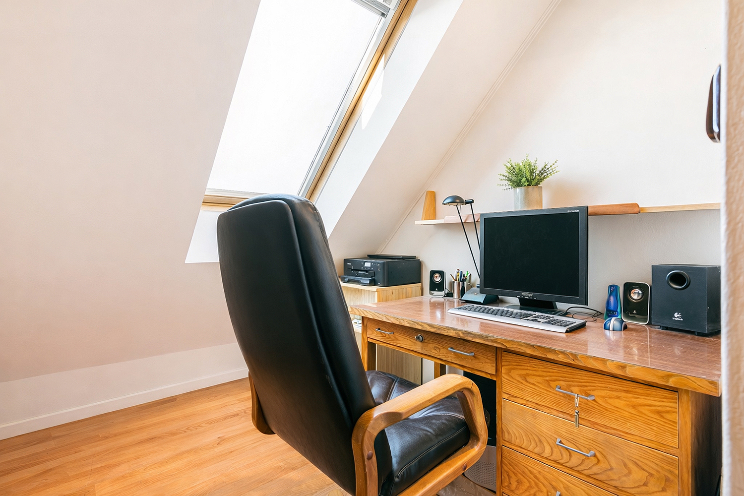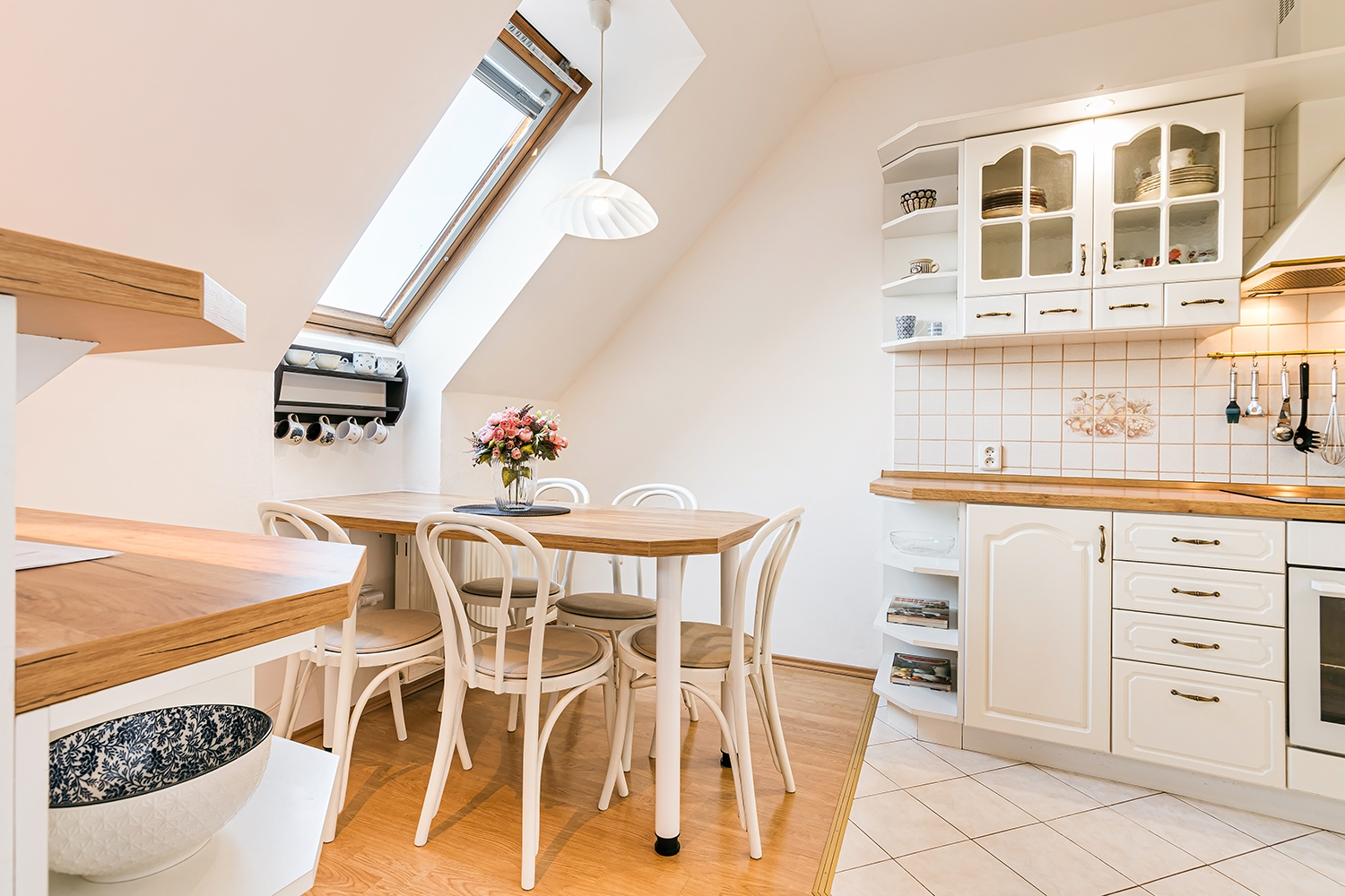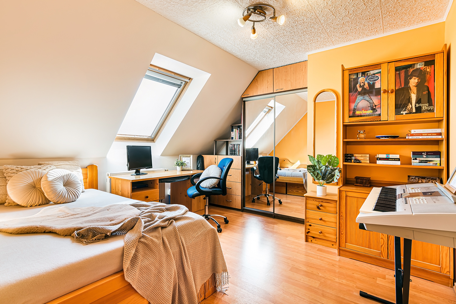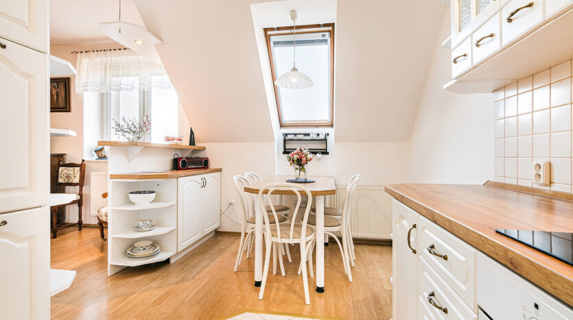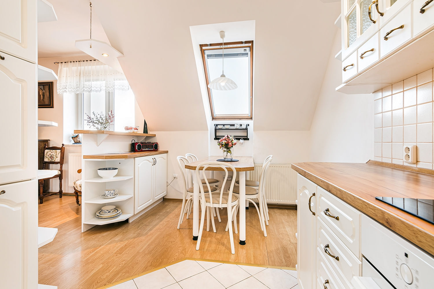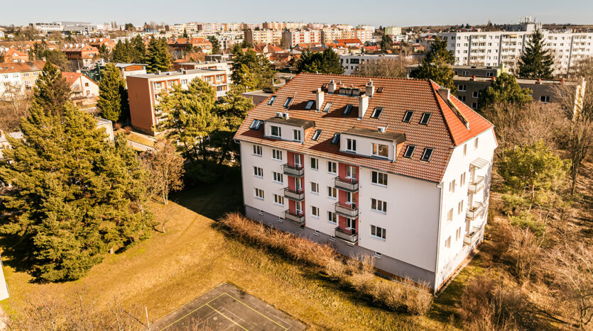 Právě takový pocit nabízí mezonetový byt na adrese Langrova 11 v brněnské Slatině. Nachází se v 4. a 5. patře domu a vznikl jako přístavba na cihlovém domě v roce 1997. Ve výsledku tak působí trochu jako samostatný dům posazený na střeše domu.