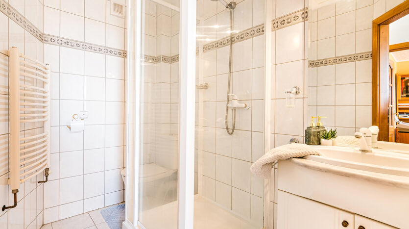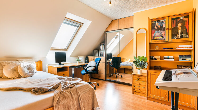 Ve spodním podlaží se nachází obývací pokoj (25,90 m²) a kuchyně s jídelnou (12,70 m²), koupelna (7,20 m²), oddělený záchod (1,10 m²) a také ložnice (15,75 m²) s přímým vstupem na lodžii (5,65 m²). V patře jsou pak dva samostatné pokoje (13,50 m² a 11,30 m²), pracovna (4,80 m²) a druhá koupelna se sprchovým koutem a toaletou (4,60 m²). Dispozice tak nabízí dostatek prostoru pro rodinné bydlení i práci z domova.